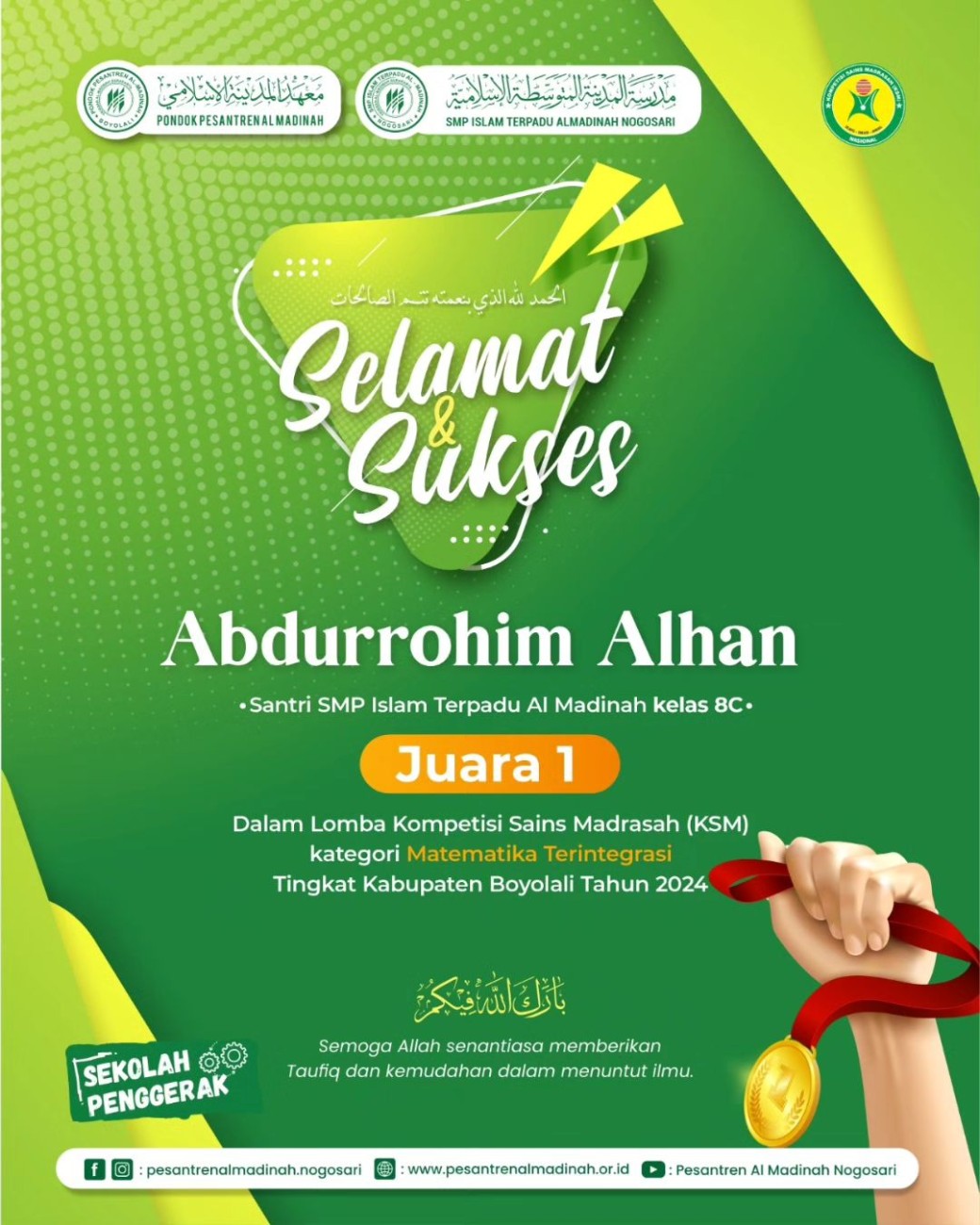 Alhamdulillah SMP Islam Terpadu Al Madinah pada tanggal 6 Juli 2024 meraih prestasi, juara 1 Kompetensi Sains Madrasah (KSM) mata pelajaran matematika terintegrasi dan juara 1 Kompetensi Sains Madrasah (KSM) mata pelajaran IPS terintegrasi. atas nama Abdurrahman Alhan dan Ubaidullah.