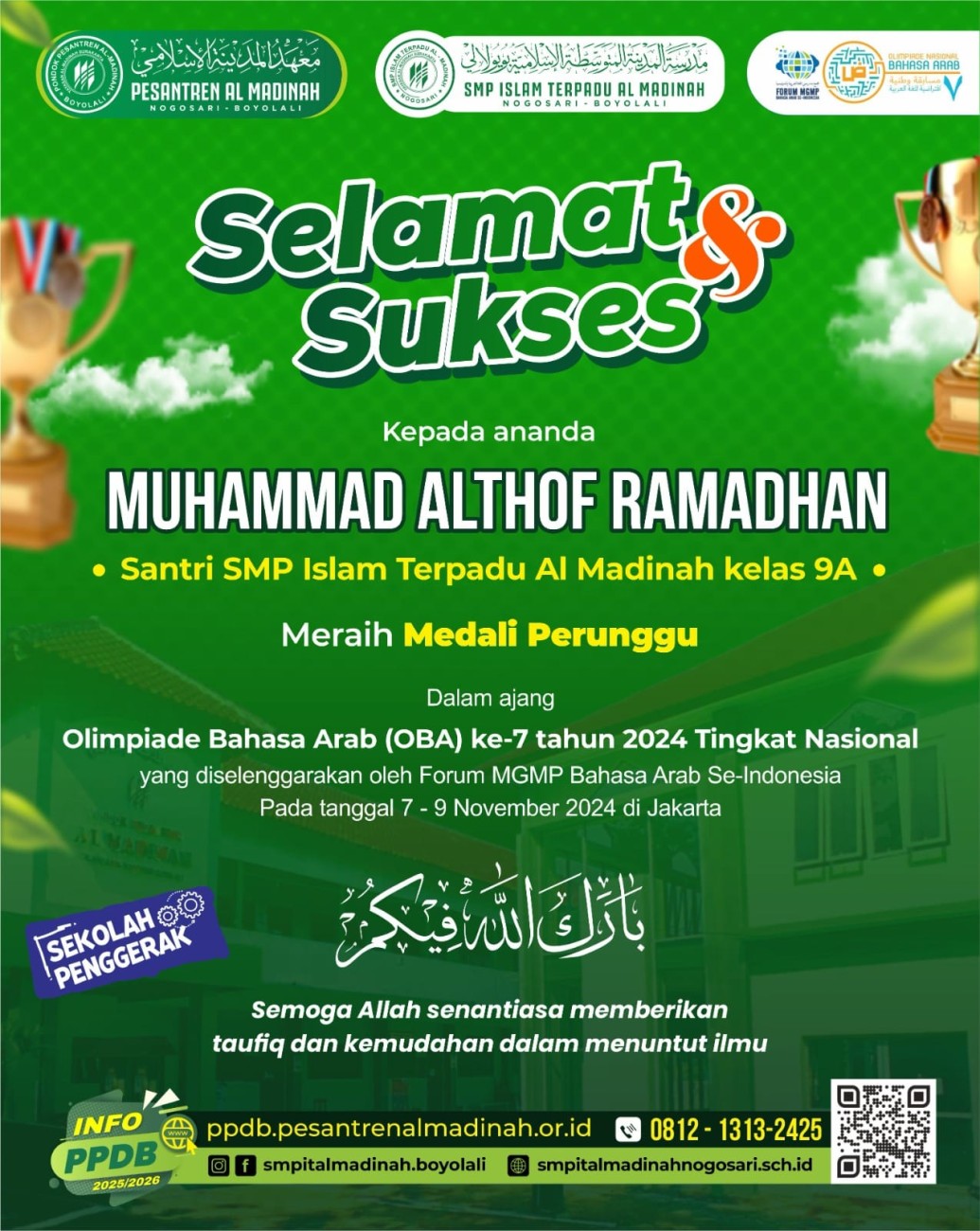 Pada tanggal 7 - 9 November 2024 ananda Muhammad Al thof Ramadhan mendapatkan kehormatan untuk mewakili sekolah dan juga provinsi Jawa Tengah untuk mengikuti Olimpiade Bahasa Arab (OBA).